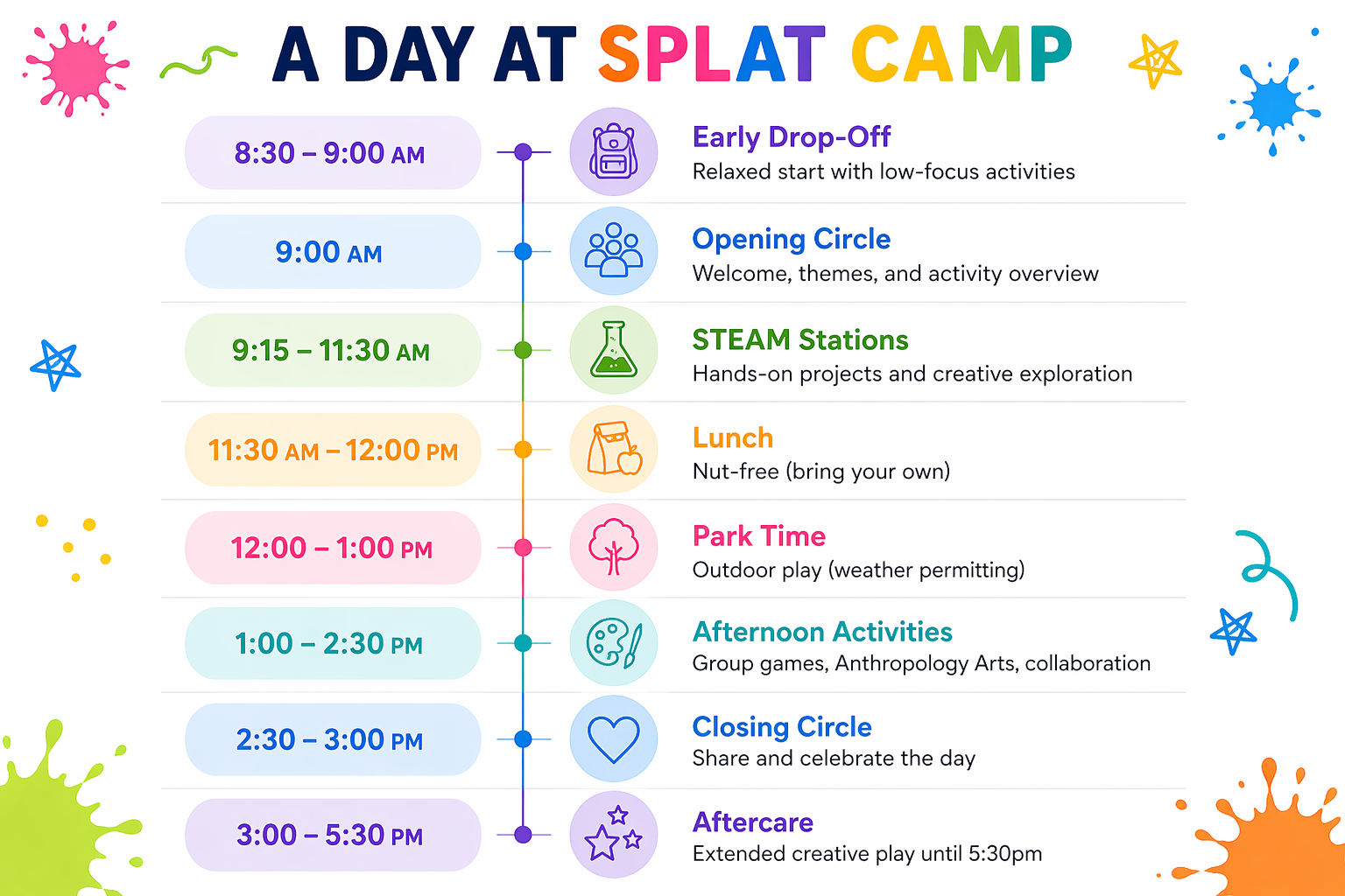Daily art, science, and messy play led by caring educators. For ages 4–10, with early drop-off and aftercare available.